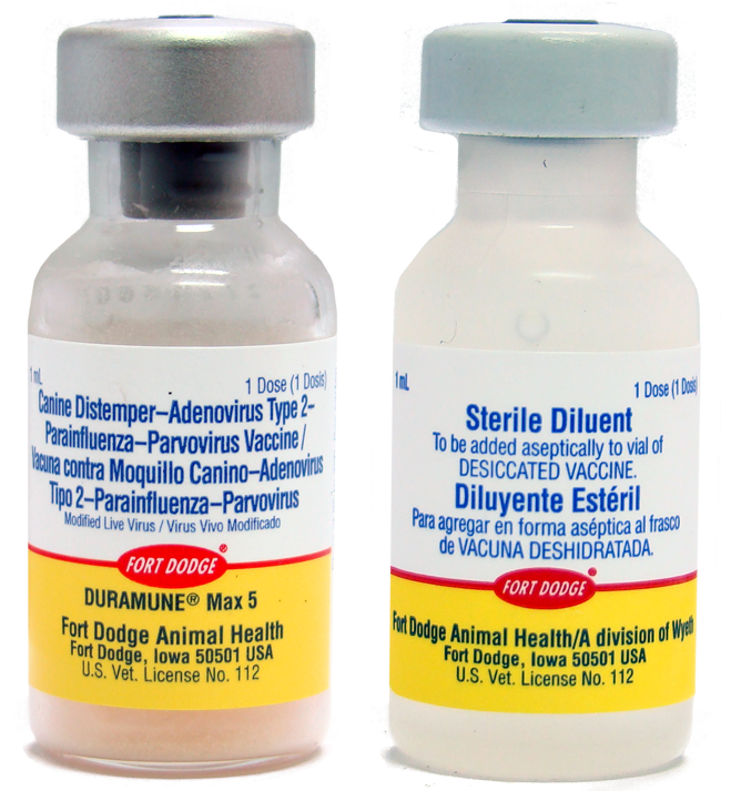 - Duramun Max5/4L (Дурамун Макс 5/4Л; Fort Dodge Animal Health) - вакцина предназначена для активной иммунизации собак против чумы, парвовироза, аденовирусных инфекций, парагриппа и лептоспироза (4-х серовариантов). Duramun Max5-CVK/4L – имеет в своем составе еще и антиген коронавируса.