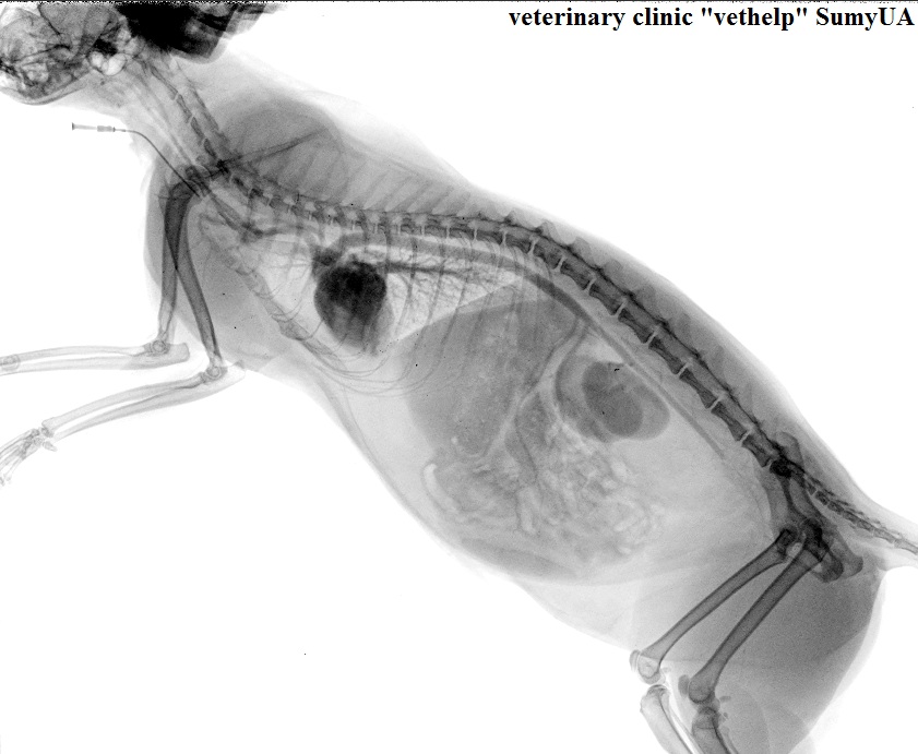 Ангиография (введение рентгенконтрастного вещества в сосуды, в результате чего на снимке (в течении нескольких сек.) становиться возможным видеть кровеносное русло): По результатам чего был поставлен диагноз - тромбоэмболия брюшной аорты у 5ти летнего кота с ГКМП (гипертрофическая кардиомиопатия диагноз поставлен по средством ЭХО-кардиграфии). Причина обращения: кот перестал ходить на задние лапы и сильно кричал от боли. На снимках видно начало введение контраста и его движение по сосудам, а также место где резко прерывается сосуд - эт и есть тромб :(